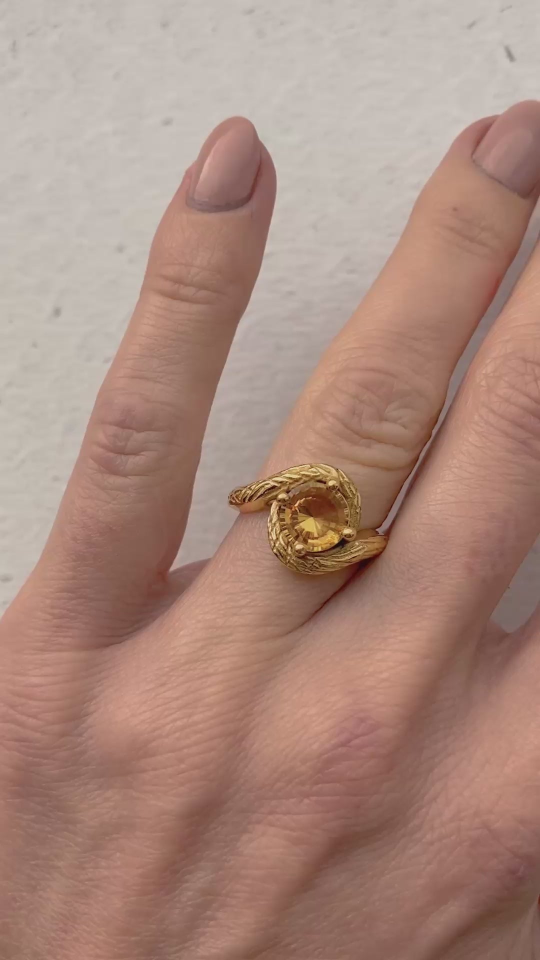 Statement ring in sterling silver with 5 micron 18 karat gold vermeil. Citrin fancy cut with a diameter of 8 mm in the centre. Width: from 2,8 mm to 13,1 mm.